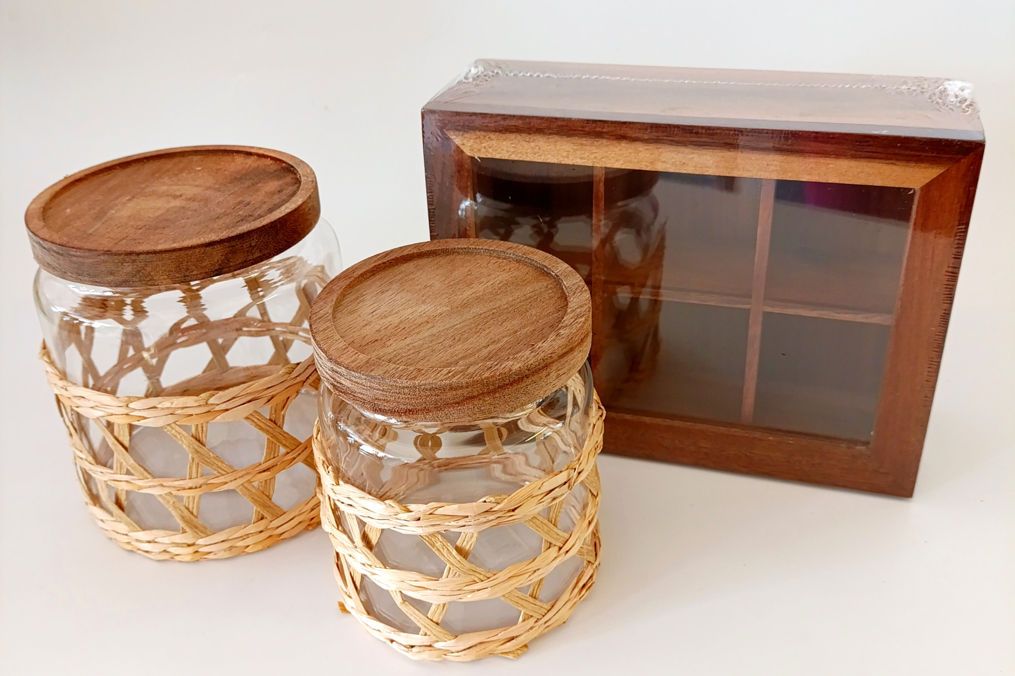 *צנצנת זכוכית עגולה מעוצבת. שזירת ראטן (ניתנת להסרה), מכסה עץ אקשיה.