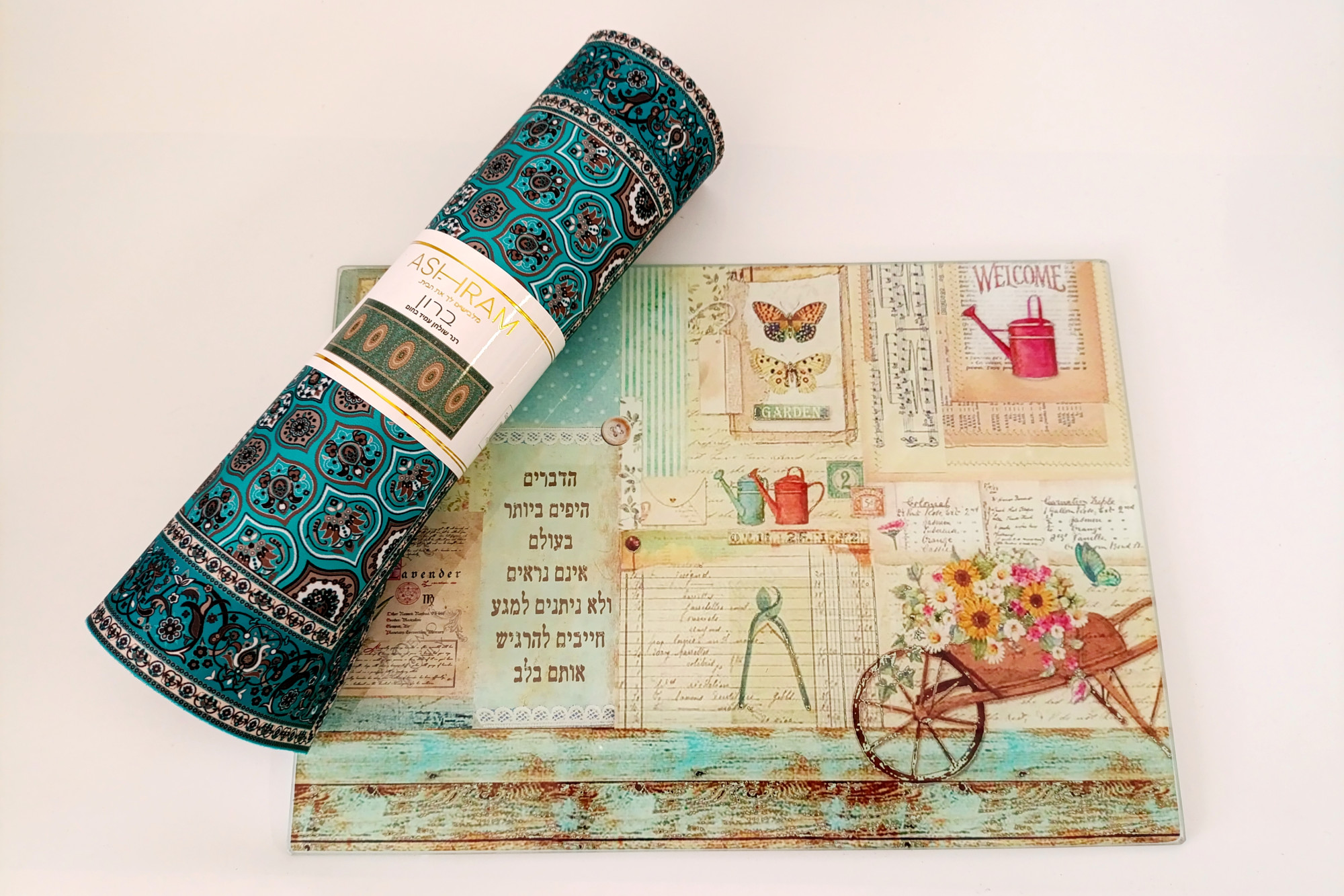 * מגש מעוצב מזכוכית, עם מסר. לחיתוך והגשה.